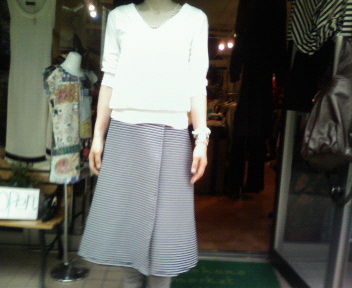 May 24, 2007 オリジナルスカート第3♪完成しました♪ またまたボーダー好きには、タマラナイスカートの完成です。 今日は、自ら試着してみました(^.^) 巻きスカートで、裏なしの一重で、これからに時期に最適な軽い、足捌きのいい、もちろんスパッツとの相性も抜群 オーダーなので、見本見ての注文受付ますね