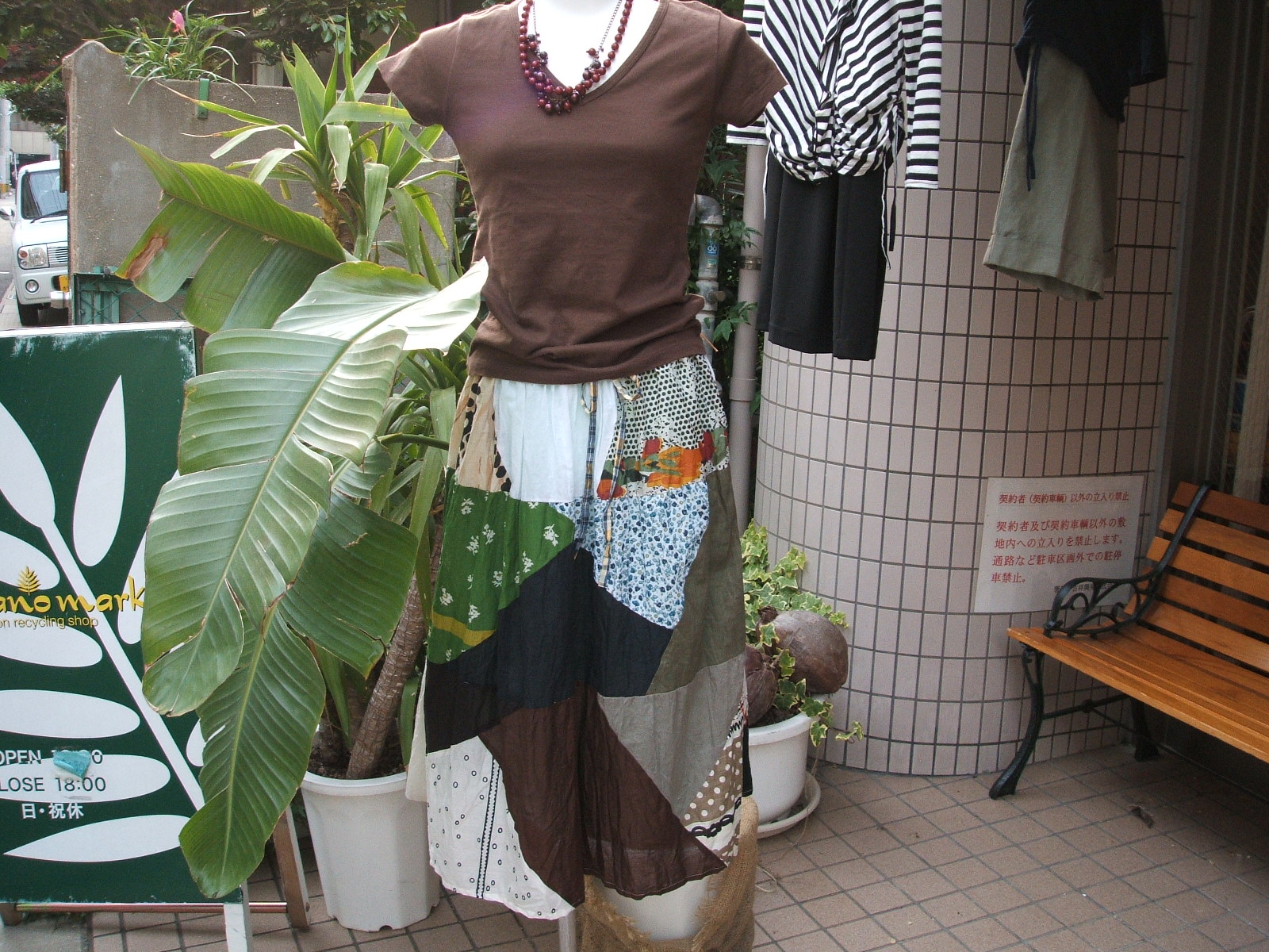 May 21, 2007 夏のお嬢さん♪ これからの季節に最適なナチュラルなコーディネートが、出来上がり大満足でブログでご紹介しようと、 ウキウキ楽しみで、ブログ入れてます パッチワーク素材の新品スカートは、きれいなギャーザーで軽い印象です。 Tシャツは、ワールドのこげちゃフレンチTです。 これにウエッジサンダル&カゴバックで夏カジュアル完成 アクセサリーは、S本さんオリジナル素敵なネックレス 明日は、このコーディネートを、お店の外でディスプレーして置きますね。